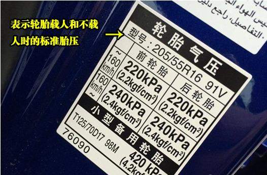 在每辆车的车身上都会贴有与胎压相关的车贴,表示轮胎载人和不载人时的标准胎压。车厂气压推荐值通常可以在以下地方找到:车辆用户手册,驾驶室车门(B柱附近)旁边的标签,车辆驾驶座旁的抽屉,油箱盖小门。(车厂胎压推荐值指的是冷却胎压)
